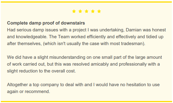 Excellent communication from Damian, very honest and open when dealing with our damp issue. Work done exactly when said, at exactly price quoted.